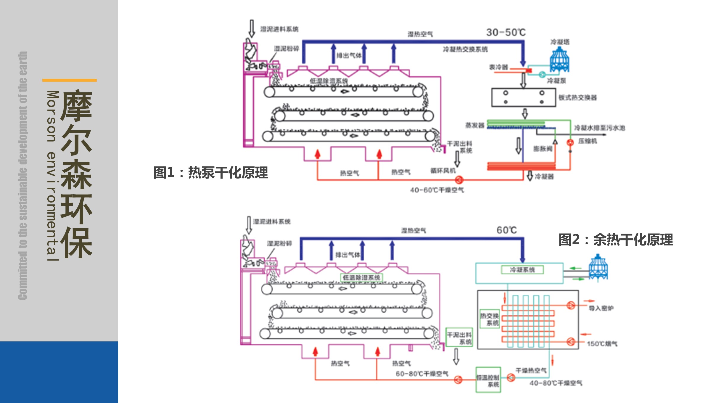 本公司除濕熱泵技術是根據逆卡諾原理,利用能效比在4以上熱泵的作用下,將污泥中蒸發出的水分中的潛熱收集并用于后續污泥中水分的蒸發。整個蒸發過程溫度不大于70℃,污泥中的揮發性有機物不易從污泥中溢出,同時整個系統為密閉系統,干化過程中的臭氣很小,不用單獨上除臭系統。低溫余熱技術主要用于有多余的熱源的情況,利用熱源中的能量來蒸發污泥中的水分。