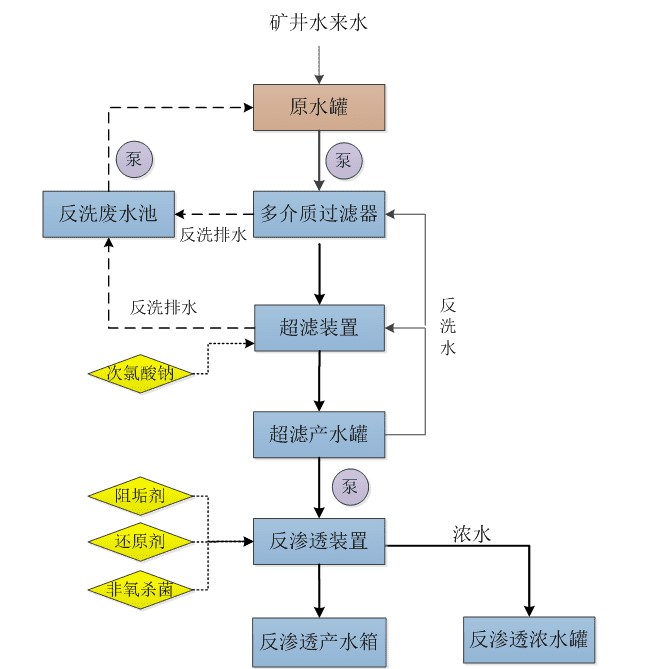 本項目的工藝流程:礦井水首先進入原水罐混合均質(zhì)原水后,經(jīng)泵提升至多介質(zhì)過濾器,去除水中的雜質(zhì)、顆粒物以及懸浮物及部分有機物后,進入超濾裝置,超濾產(chǎn)水進入超濾產(chǎn)水罐,經(jīng)反滲透進水泵提升至反滲透裝置進行脫鹽處理,產(chǎn)水進入反滲透產(chǎn)水箱供給噴淋冷卻水使用,濃水進入濃水罐中儲存。